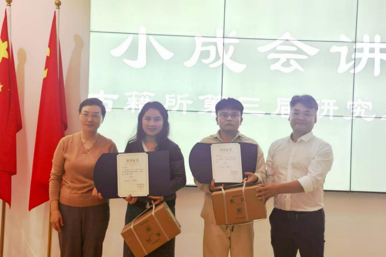 张帆、黄国信教授为一等奖获得者颁发证书及奖品影印武英殿本《四库全书总目》一部