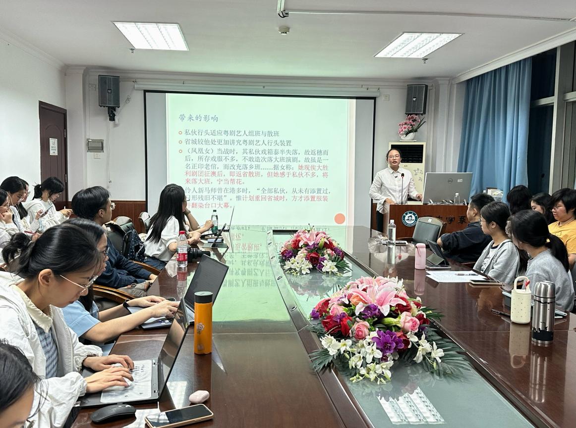 立足详实的史料与制度分析,黎俊忻博士深入梳理了粤剧私有行头制度的演进脉络:自清中叶起,粤剧界已形成注重行头的传统。晚清时期出现艺人自置私有行头的明确记载;20世纪10年代末至20年代初,受上海全女班演出热潮的推动,私有行头发展迎来首个高峰;至20世纪40年代,更多时尚道具与创新布景被引入舞台,持续丰富着粤剧的视觉表达。黎博士进一步指出,私有行头制度的形成与发展,不仅提升了舞台美术的表现力,更对粤剧行业的组织方式、行会运作及艺人生态产生了多层面的深远影响。在讲座尾声,黎俊忻博士不仅详细介绍了《广州大典・曲类》文献在戏曲研究中的应用价值,也由衷寄语在场同学,希望大家能从丰富多彩的粤剧文化中汲取积极的心灵滋养。